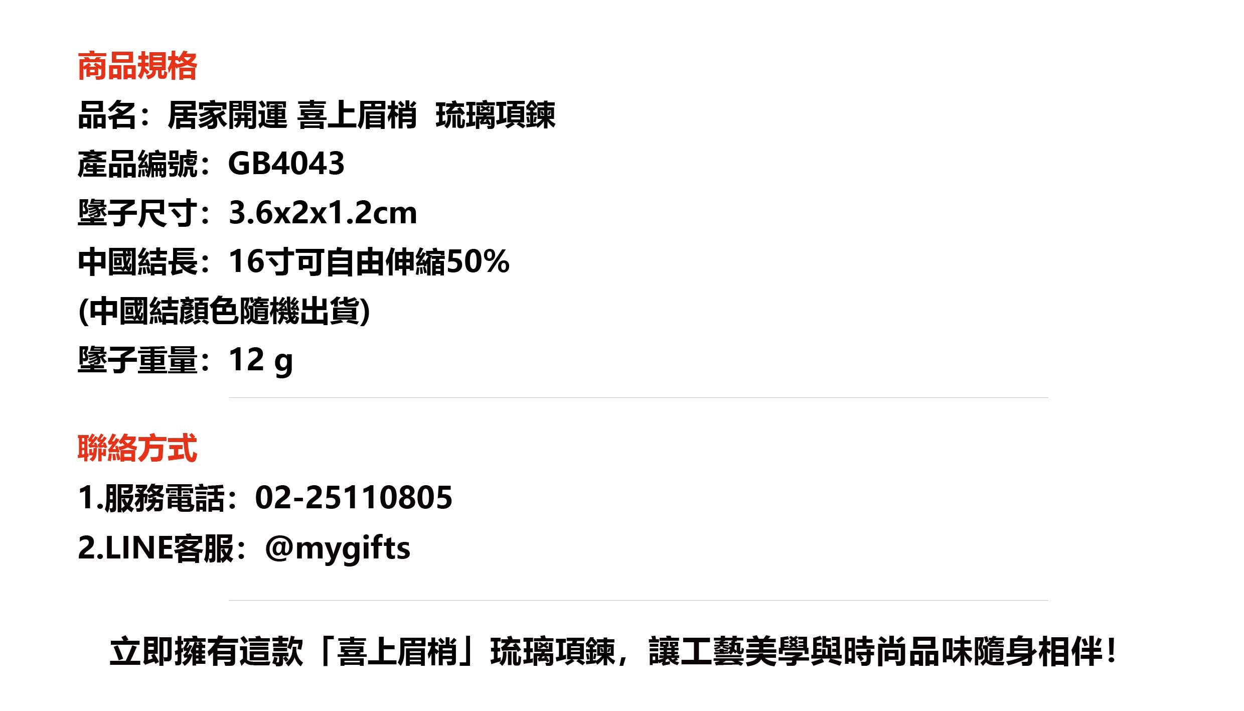 「喜上眉梢」為中國傳統吉語,象徵喜訊臨門、福氣盈門。本款琉璃項鍊融合梅花與喜鵲的意象,結合手工琉璃技藝,展現傳統文化中的祝福寓意,是一款能帶來喜悅與美感的開運飾品。