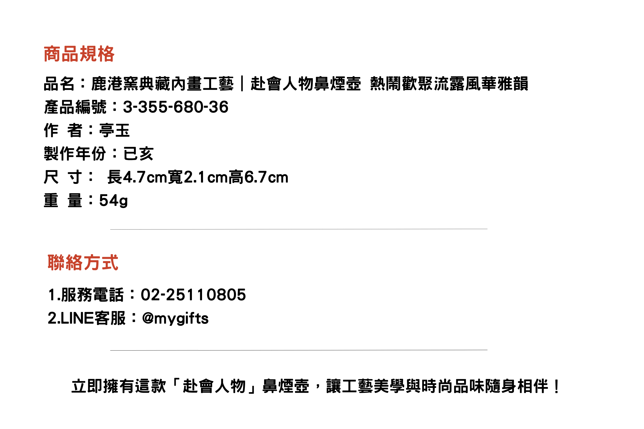 鹿港窯典藏內畫工藝赴會人物鼻煙壺,以細膩筆觸描繪熱鬧聚會場景,展現傳統雅士風範與人文風情,承載濃厚文化韻味,收藏與送禮皆宜。