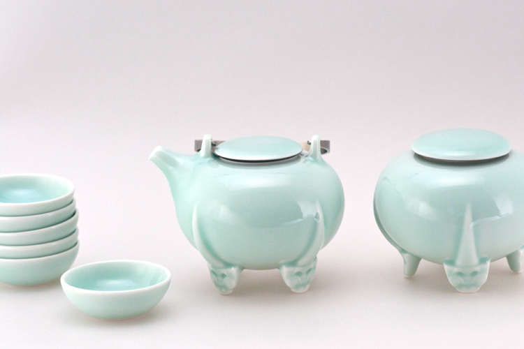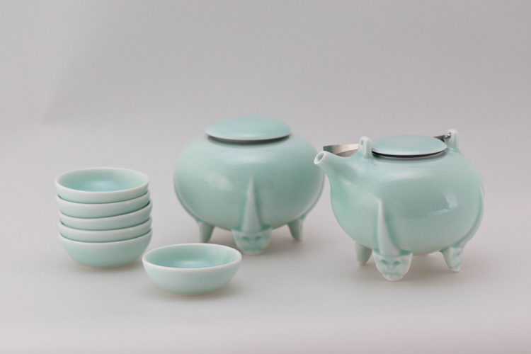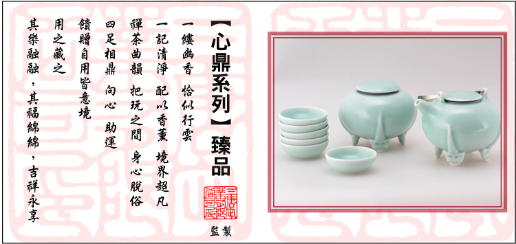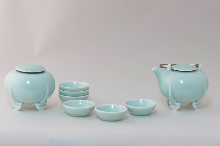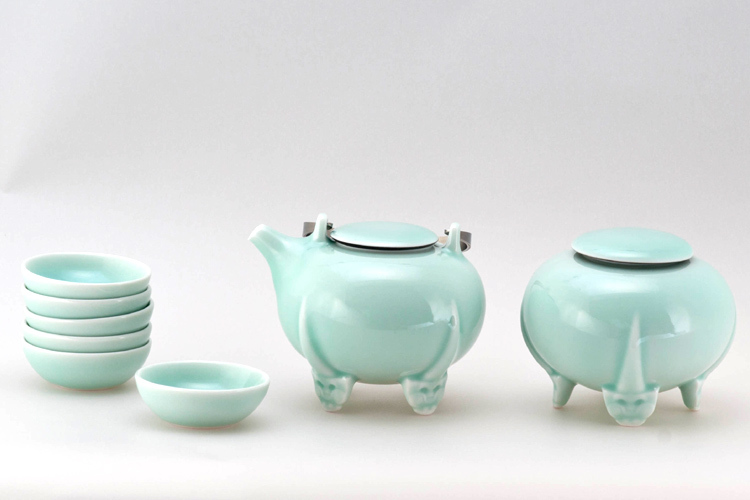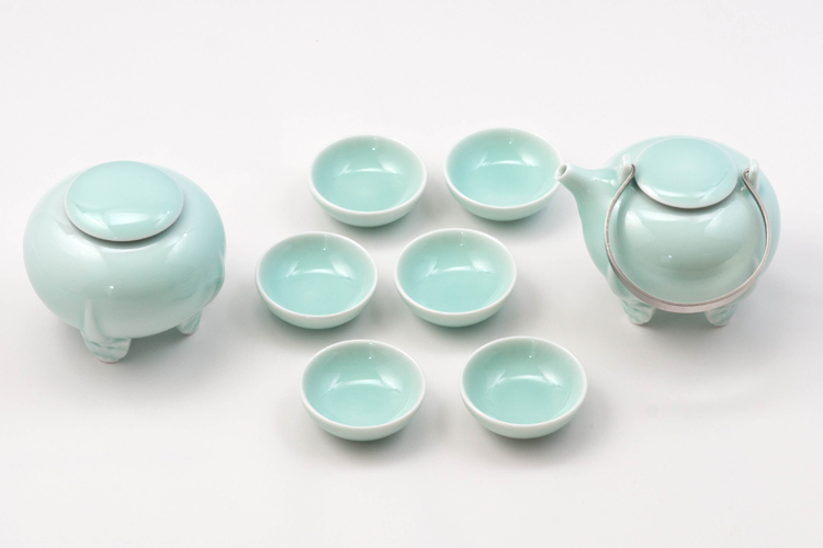玉砂青瓷鼎式茶具組,1壺1罐6杯,典雅造型,質感細膩,品茗收藏首選。