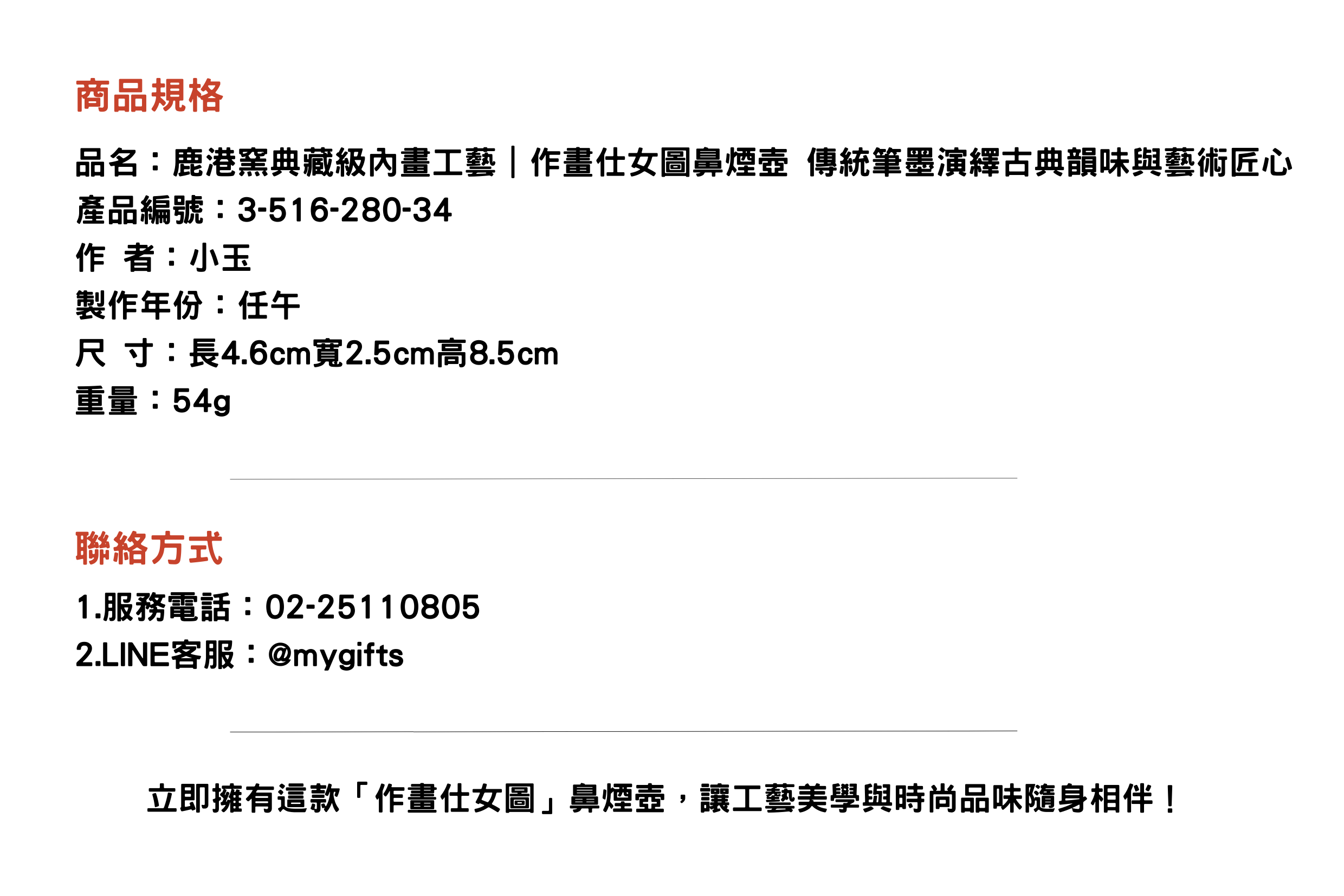 鹿港窯典藏級內畫鼻煙壺,以作畫仕女圖為題,展現傳統筆墨藝術的雅韻與匠心。精工內畫描繪仕女專注揮毫的神韻,薄胎工藝透光細膩,搭配瑪瑙蓋,極具收藏價值與文化內涵,適合雅士珍藏與贈禮。