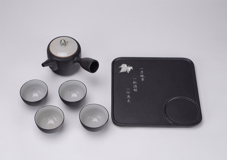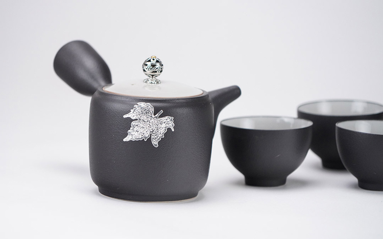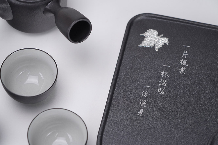 老岩泥結合錫銀鑲嵌,楓葉噴砂工藝,典雅便攜旅行茶具,壺身可客製企業Logo,品味生活首選。