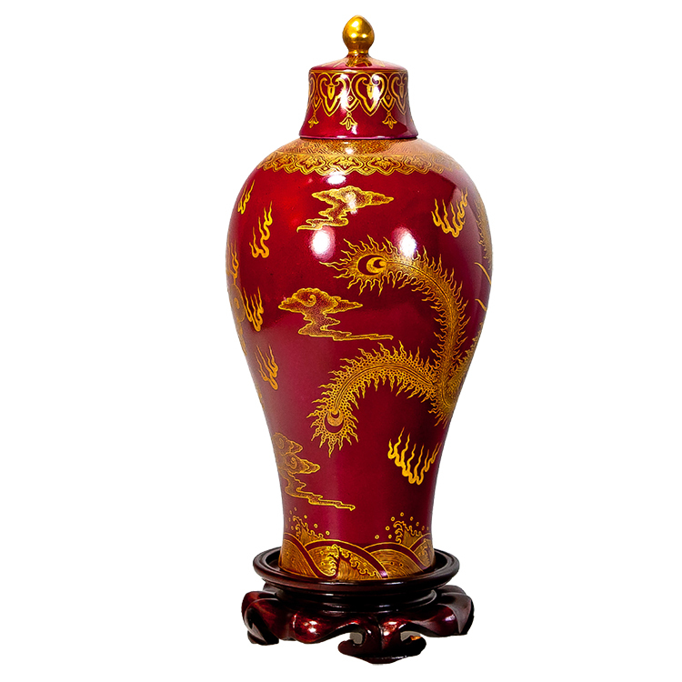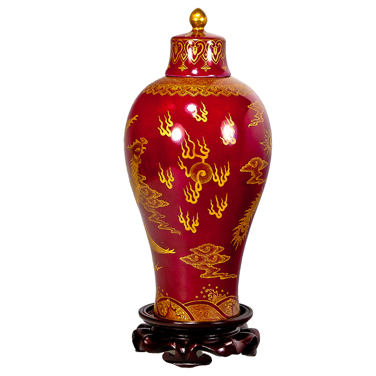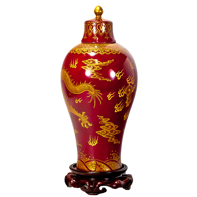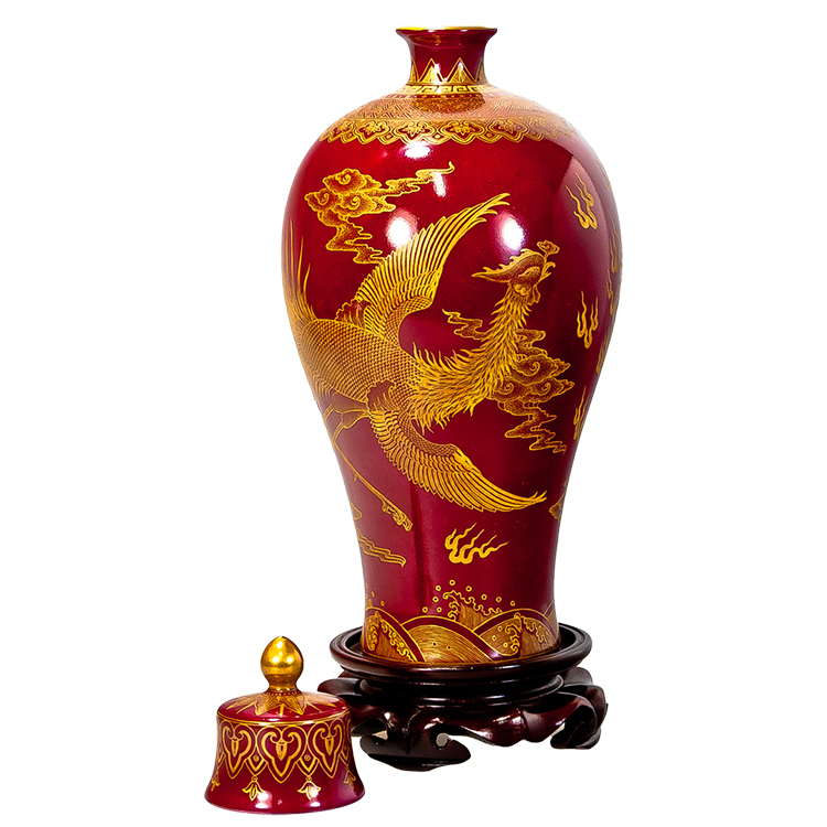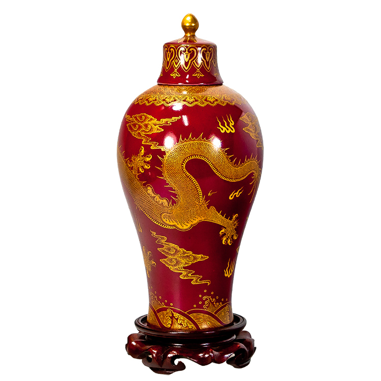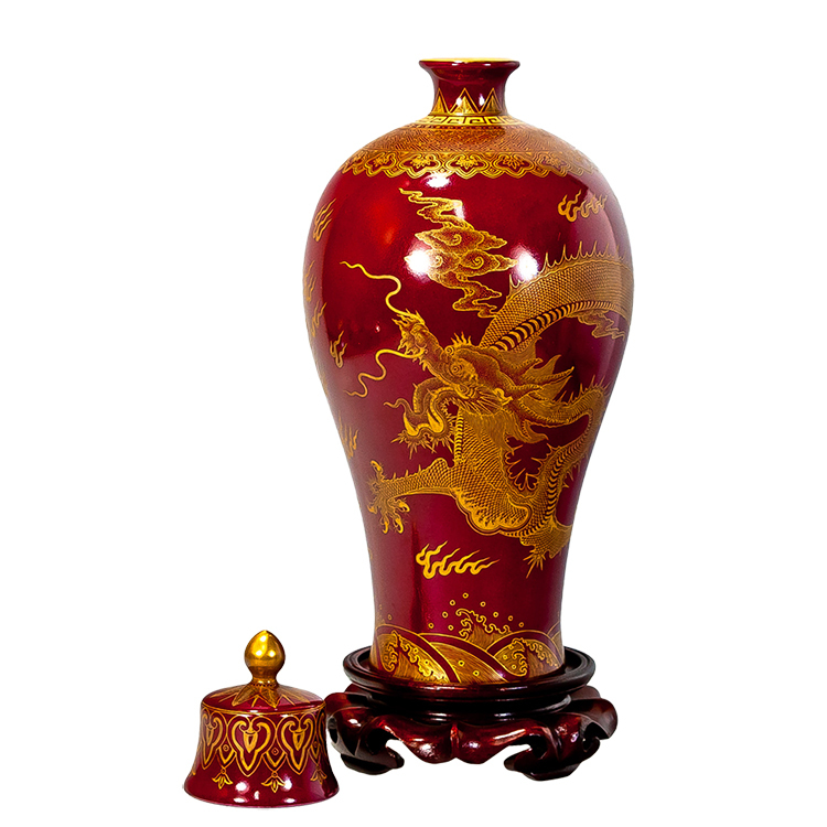 雕金工藝:在燒成的棗紅釉上塗抹金膏,再以精細刀工雕刻龍鳳圖案,最後經低溫烘燒而成。金碧輝煌,更顯皇家氣派。