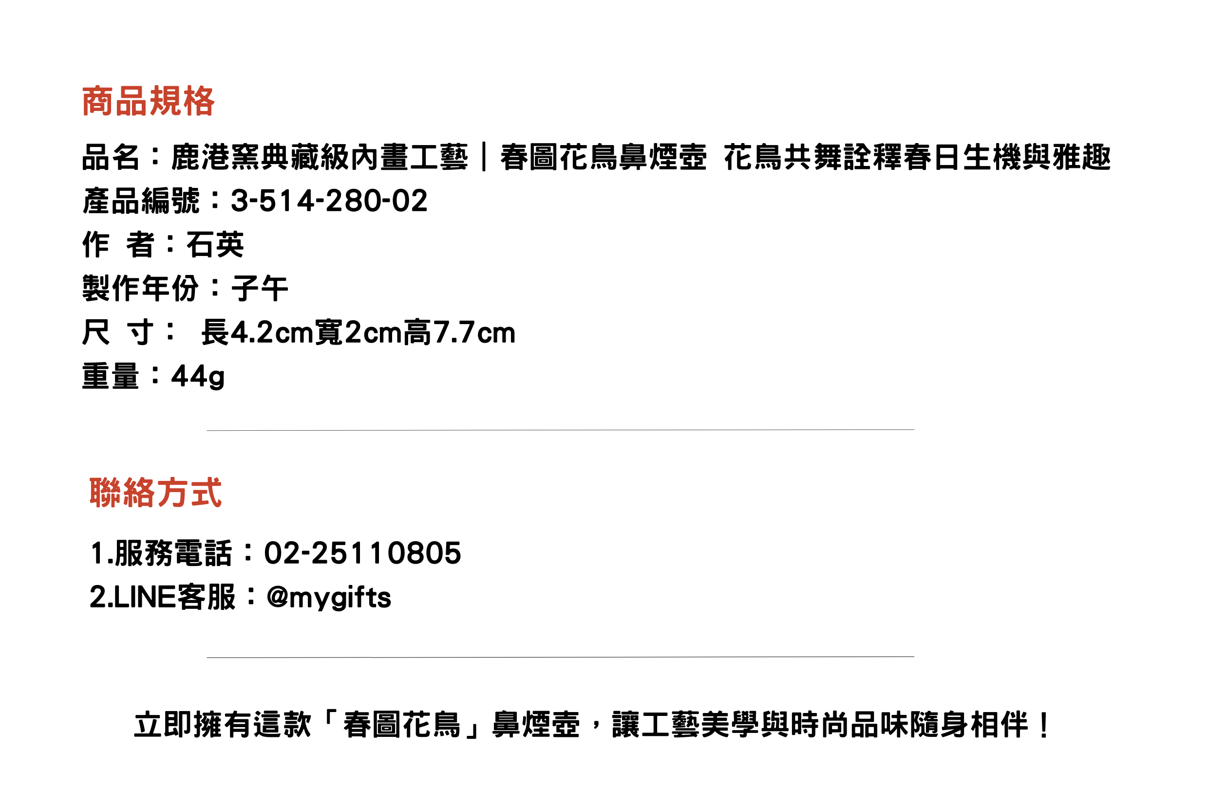 春天象徵著萬物復甦、生機盎然,本款春圖花鳥鼻煙壺以精湛的內畫技藝,細膩描繪花鳥相映的畫面,將春日的盎然氣息凝縮於方寸之間。輕盈透亮的水晶壺身襯托出畫面細節,每一筆勾勒皆展現出傳統工藝的非凡韻味,是珍藏與贈禮的極佳之選。