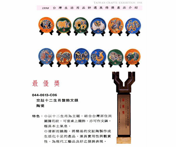 融合十二生肖與原住民圖騰,兼具實用與觀賞價值的交趾陶文鎮,獲1998台灣手工藝最優獎,極具本土特色。