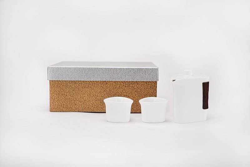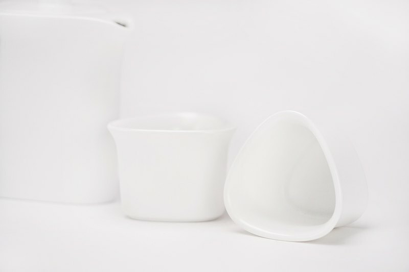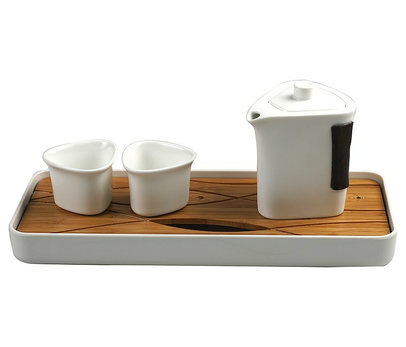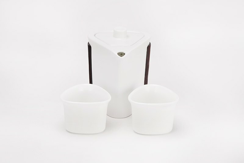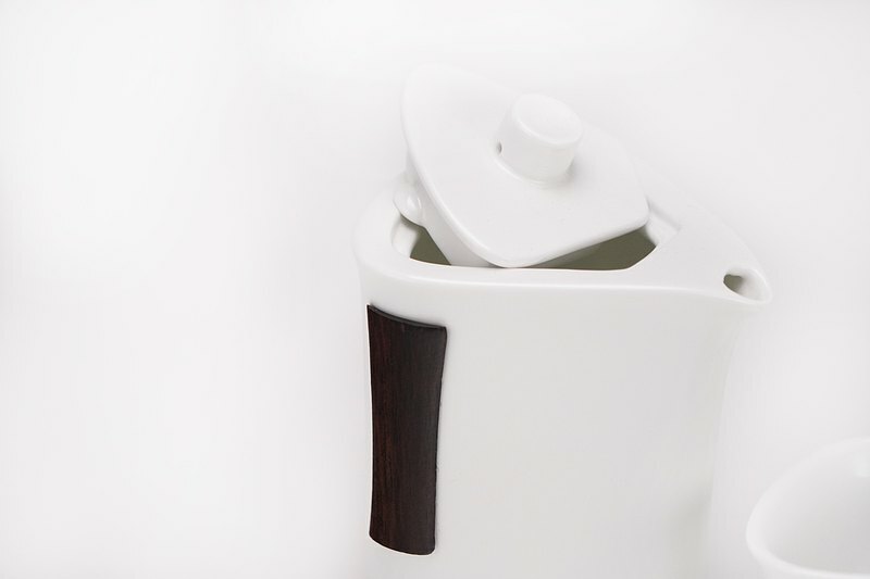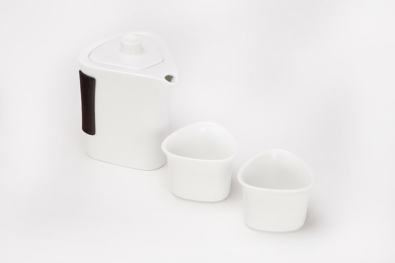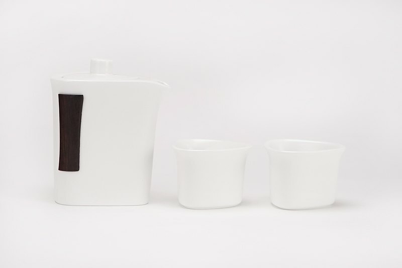 創意打破傳統器形,利用三角穩定的結構定律,再造不規則器形,壺嘴設計以切合人體品飲舒適度,壺身兩側的木片,雙手好把握有效防燙,倒茶時姿勢,類似“掌握”一樣的安穩自信。一壺兩杯的搭配,在茶事體驗中,不多不少,茶、水、器三者互相成就,如魚得水。