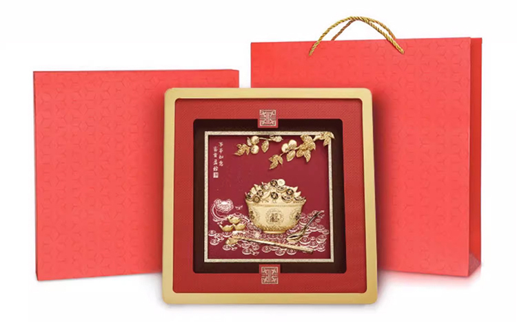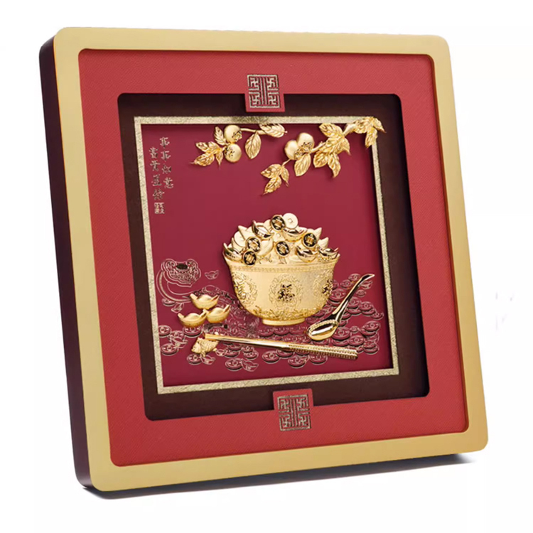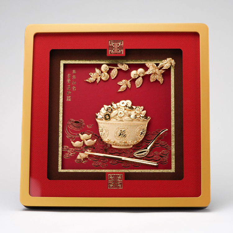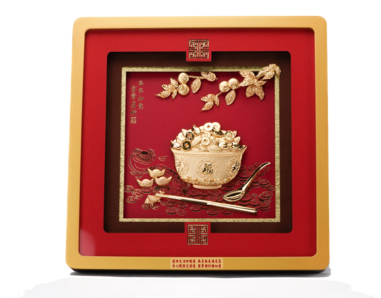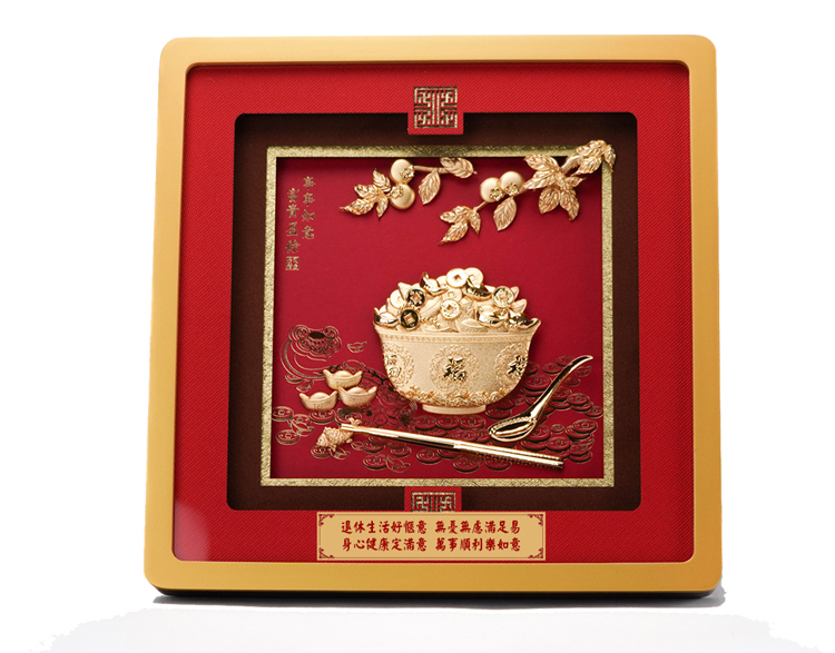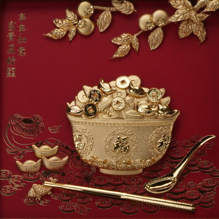 此款事事如意富貴盈餘掛畫以足金金箔製作,製作元素包含金飯碗,裝滿金元寶、金幣,並以金如意、湯匙、筷子、柿子、呈現。象徵事事如意富貴盈餘。
