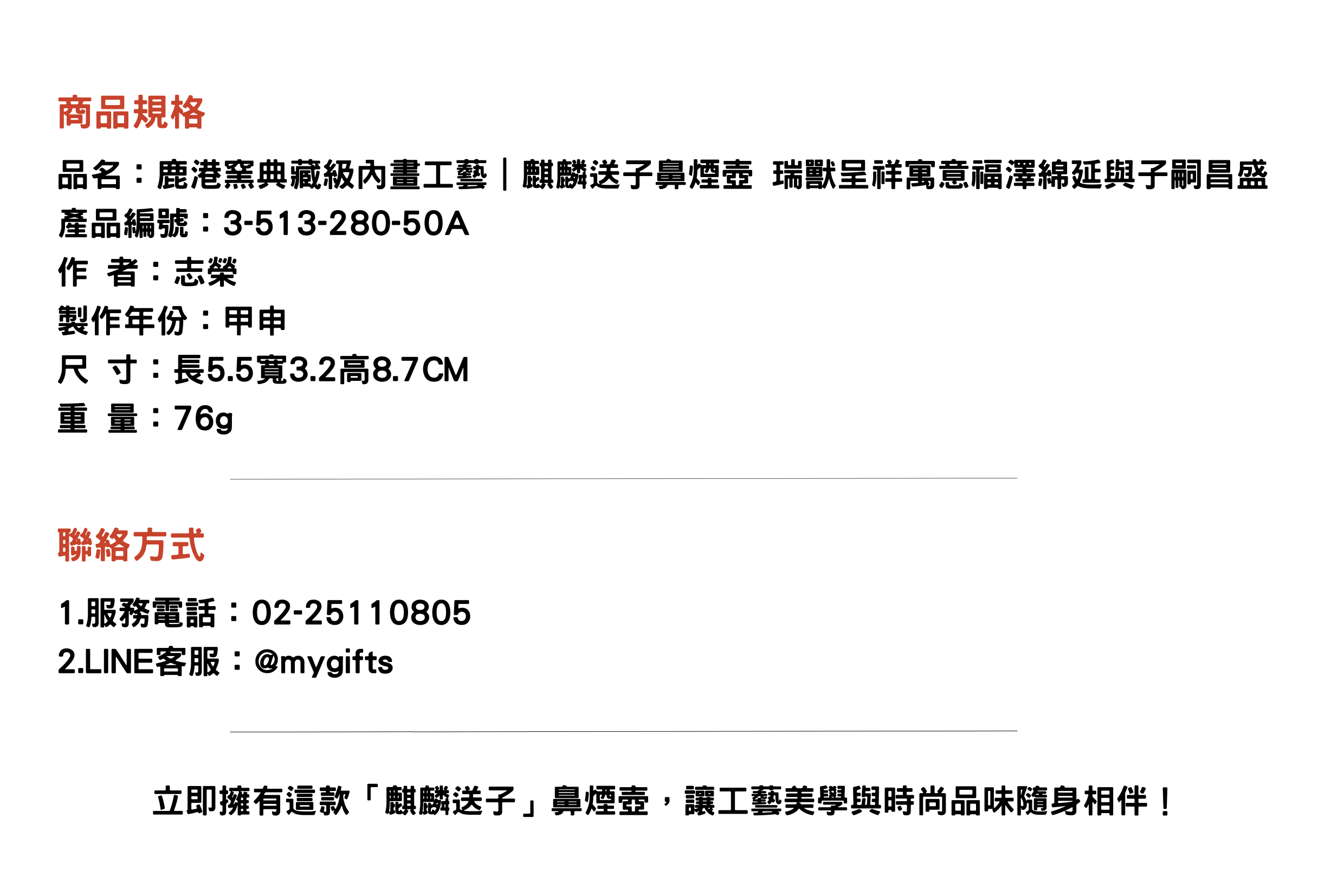 麒麟送子鼻煙壺,以瑞獸麒麟與童子為題,寓意福澤綿延、子嗣昌盛。內畫工藝精湛,筆觸細膩,壺身通透典雅,適合作為收藏珍品或吉祥贈禮,象徵美滿與幸福。