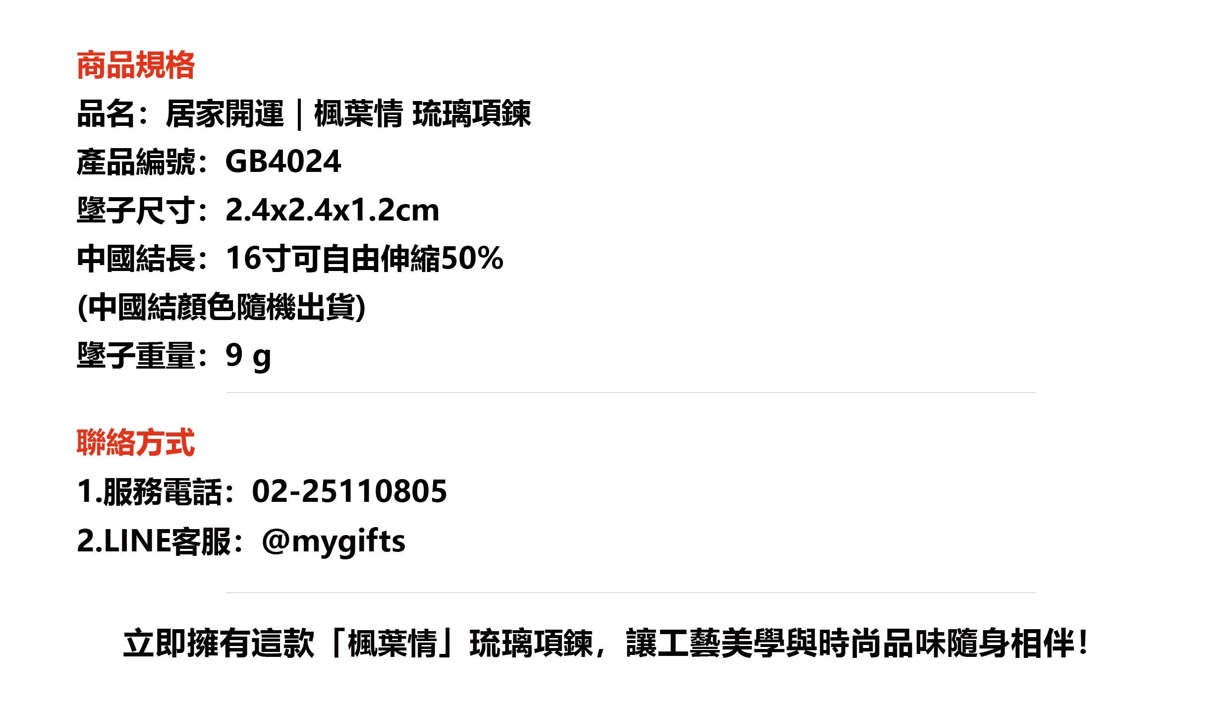 楓葉自古象徵堅毅、成熟與深情,亦代表季節更迭中的靜美與祝福。此款「楓葉情」琉璃項鍊將秋日意象融入東方工藝,以細膩造型與溫潤色彩展現自然流轉中的生命哲思,是一件富含情感意境的雅緻佩飾。
